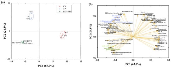 Principal component analysis (PCA) was performed based on the peak areas of VOCs (Figure 9). PCA has a distinctive advantage in classifying samples based on multiple data variables [33]. The combined contribution of PC1 and PC2 accounted for 89.8%, which was sufficient to explain the similarities between the different treatments (Figure 9a). PC1 effectively distinguished unprocessed sea buckthorn juice from processed versions, and PC2 discriminated CK and PEF-HPP from TP. Although PEF-HPP treatment did not completely preserve the fresh flavor, it offers a good alternative to TP.