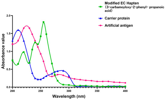 The ultraviolet-visible spectrum of the modified EC hapten, bovine serum albumen (BSA) as the carrier protein, and the purified artificial antigen towards EC (conjugated by BSA and the modified EC hapten).
