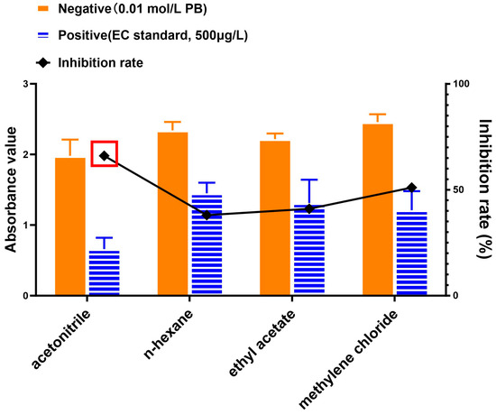 In accordance with the results of previous research [9,14,24,27], acetonitrile, n-hexane, ethyl acetate, and methylene chloride were selected in this study to explore their extraction efficiency for EC. Specifically, 1 mL of standard solution (EC, 500 μg/L) was mixed with 2 mL of the extraction solvent for the positive wells (when acetonitrile was used, sodium chloride would be added in the extraction system) and 0.01 mol/L PB was used for the negative wells. Following dissolution by vortex mixing for 1 min and sonication for 15 min, 1 mL of the organic phase was aspirated and dried under a gentle stream of nitrogen gas at 60 °C. The residue was reconstituted to 1 mL with 0.01 mol/L PB solution. The rest of the analytical steps were similar to those mentioned in the sections of “Extraction“ and “ELISA testing procedures”. The absorbance value of the wells free of EC (Amax) and the inhibitory effect/ratio were used to interpret the results. For evaluation of the inhibitory effect/ratio, an inhibitory curve was established by setting the logarithmic values of the EC standard concentrations as the values of x-axis, and the B/B0 as the values of y-axis. In this study, B/B0 typically represents the ratio of absorbance in the samples with the concentrations of EC as same as those without EC. The inhibition effect was calculated as follows: Inhibition rate (%) = (1 − B/B0) × 100.
