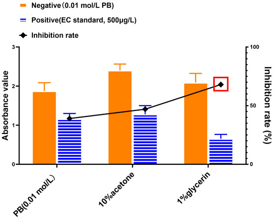 Different solutions were tested for maximizing the response of matrix-extracted EC. As with the previous section, our developed competitive immunoassay was employed to compare results, but in this case for the comparison of resuspension of EC-extracted samples. As displayed in Figure 4, the absorbencies for all tested resuspension agents were similar for “Negative” (background samples) whereas the absorbency for the 1% glycerol was the lowest (best inhibition) for the “Positive” sample. In addition, the inhibition rate of 1% glycerol solution was the highest among all the reconstituted solutions. As a result, 1% glycerol was selected to reconstitute extracted EC samples.