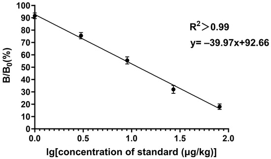 First, 1 g of the sample was mixed with 2 mL of acetonitrile and 0.4 g of sodium chloride. Then, the mixture was dispersed by vortex mixing for 1 min, then subjected to sonication for 10 min. Subsequently, the mixture was centrifugated at 8000× g for 10 min, and the supernatant was evaporated to near dryness with nitrogen at 60 °C. The residue was re-dissolved in 500 μL of the optimal reconstitution solution. After about 1 min of vortex mixing, 50 μL of the solution was used for further ELISA analysis.