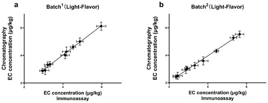 To test the feasibility of the newly established method, a total of 39 samples were collected from Baijiu industry suppliers, including Jiupei and Jiuzao ones. A parallel analysis was performed in these samples, both by the ELISA and the confirmatory method, GC-MS. According to the results (Figure 6), a good correlation was achieved (R2 > 0.99), and the absence of false-negative and false-positive results suggested that this method enabled quick screening and reliable quantification for Jiupei and Jiuzao samples. Furthermore, although various mitigation practices had already been implemented to control EC formation in the whole chain of Baiji, the presence of EC at a level which exceeded the LOD was still observed in all the samples. The detection range of EC was from 2.36 μg/kg to 7.08 μg/kg, with the highest concentration of 7.08 μg/kg in the Jiupei sample. Additionally, the content of EC increased during the fermentation period of Baijiu, which was consistent with the previous literature [11]. Many factors involving in the fermentation and distillation of Baijiu can contribute to EC formation, such as high temperature, pH value, and some strains of bacteria and yeast [11,12]. Our study indicates that the contamination of EC during Baijiu production still exists, and should not be neglected.