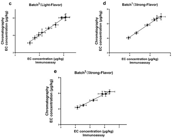 The correlation results of EC detection by ELISA and GC-MS in real samples of (a) batch1 of Light-Flavor; (b) batch2 of Light-Flavor; (c) batch3 of Light-Flavor; (d) batch1 of Strong-Flavor; (e) batch2 of Strong-Flavor. “Light-Flavor” and “Strong-Flavor” categorize different types of Baijiu, and the duration of fermentation for the initial product is quicker, resulting in a more refreshing flavor profile.