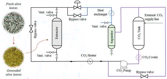 The olive leaves used in the present study were from the Koroneiki variety (Olea europaea var. microcarpa alba) and were collected from the olive grove of the Department of Food Science and Technology of the School of Agriculture of Aristotle University of Thessaloniki at altitude of 39 m during March of 2022. The leaves were dried in an oven at 35 °C for 48 h, homogenized using a Pulverisette 11 Knife Mill (Fritsch GmbH, Idar-Oberstein, Germany) at 6000 rpm for 20 s, sieved using a sieve shaker (type LS10, No. 4082, Retax, Labor Siebmaschine, Hemmingen, Germany) and stored in a freezer (−22 °C) until SFE. The average particle size of grounded olive leaves was <0.55 mm.