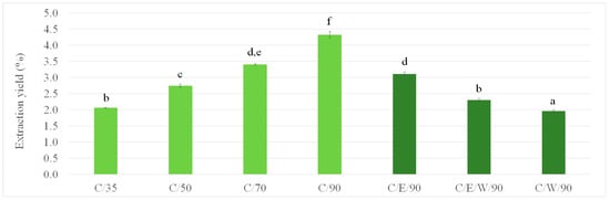 In the present study, an environmentally friendly SC-CO2 methodology for the extraction of value-added compounds from olive leaves was proposed. Initially, four different extracts were prepared employing temperatures ranging from 35 to 90 °C and neat CO2 without any co-solvent. As can be seen in Figure 2, the extraction carried out with neat SC-CO2 at 90 °C was found to result in the highest yield (4.3%) followed by SFE at 70 °C (3.4%). A decrease in extraction temperature to 35 °C led to a statistically significant decrease in extraction yield up to 2.1%. The observed increase in separation of OLE with the increase in temperature could be attributed to the vapor pressure enhancement, increased solubility of the bioactive compounds of olive leaves in SC-CO2, and facilitated diffusion [10,29,30] despite decreased density of the medium (i.e., SC-CO2 density decreased from 929 kg/m3 at 35 °C to 704 kg/m3 at 90 °C). Previously reported yields of SFE indicated slightly lower values compared to the one obtained in this study. The reported yield of OLE obtained at 30 MPa and 50 °C was 1.0% [15], at 25 MPa and 80 °C was 2.8–3.5% depending on the leaves’ drying temperature [5], at 10–30 MPa and 50 or 100 °C was 0.7–2.1% [10], at 45 MPa and 40 °C was up to 0.6% [30], etc. Observed differences can be ascribed to parameters of the SFE process (pressure, temperature, operating time, solvent flow), type of extraction unit, material storage, moisture, and pretreatment [31], as well as the influence of olive tree variety, cultivation, and harvesting time.