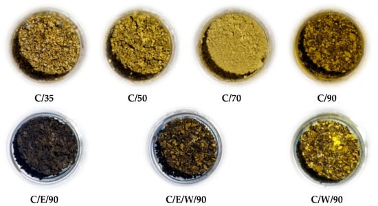 Changes in process parameters also influenced the color of obtained extracts, as can be seen in Figure 3. The highest temperature of 90 °C used for SFE led to the separation of the darkest color extract. The use of ethanol as a co-solvent to SC-CO2 only darkened the color of OLE. The color of extracts is attributed to the presence of pigments that impart color to plants. The appearanceof olive leaves is mainly related to the presence of chlorophylls whose color masks the color of carotenoids that are also present.