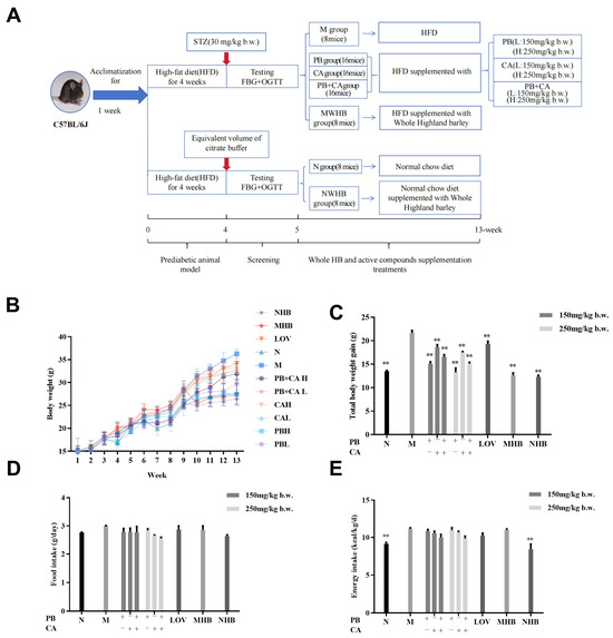 Procyanidin B1 and coumaric acid from whole-grain highland barley reduced body weight in HFD-fed mice. (A) Experimental protocol and design; (B) changes in body weight over 12 weeks and (C) body weight gain; (D) mean food intake and (E) mean energy intake. Data are shown as means ± SEM, with n = 8 mice per group. Significant differences between groups and model group (M) were analyzed with one-way ANOVA with Dunnett’s multiple comparison test and are indicated by ** for p < 0.01. PBL and PBH: model group supplemented with procyanidin B1 at low and high dosages, respectively; CAL and CAH: model group supplemented with coumaric acid at low and high dosages, respectively; PB + CA L and PB + CA H: model group supplemented with combination of procyanidin B1 and coumaric acid at low and high dosages, respectively; M: model group; N: normal group; MHB and NHB: model group and normal group supplemented with whole-grain highland barley, respectively; LOV: model group supplemented with lovastatin.