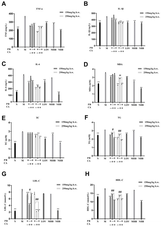 Further, the serum lipid profiles were determined to explore the effects of PB, CA, and PB + CA on alleviating hyperlipidemia. As expected, feeding mice an HFD for 12 weeks resulted in a significant increase in the serum levels of MDA, TC, TG, and LDL-C compared with the N group (Figure 2D–G). However, the supplementation with PB, CA, and the combination of PB + CA was found to significantly reduce the lipid contents in the serum in a dose-dependent manner (p < 0.05). Notably, the combination of PB and CA showed synergistic effects on decreasing the serum MDA content at a high dosage and serum TG and LDL-C contents at both low and high dosages (p < 0.05), since the related values of the combination group were significantly lower than the average value of the individual groups. On the other hand, the supplementation with PB, CA, and PB + CA significantly increased the serum HDL-C contents (Figure 2H) (p < 0.01), and the combination of PB and CA also showed synergistic effects on improving the serum HDL-C content at a high dosage. These results indicate that supplementation with PB and CA has strong effects on alleviating serum lipid deposition, with the combination of the two compounds achieving synergistic impacts.