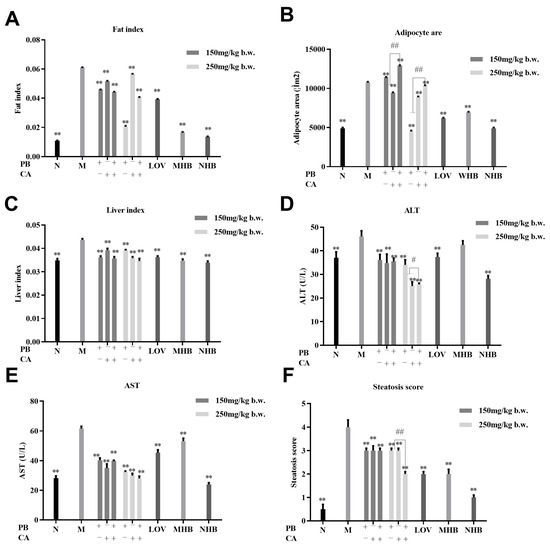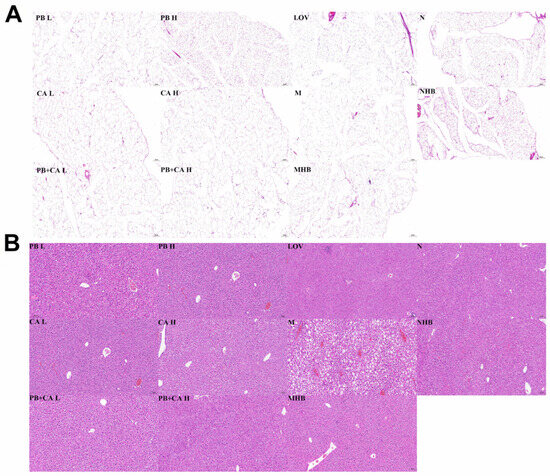 As shown in Figure 3C, the supplementation with PB and CA also led to a reduction in the liver index. Furthermore, severe hepatocyte ballooning degeneration, hepatic vacuoles, and inflammation infiltrates were observed in the M group compared with the N group in Figure 4B. These effects were significantly mitigated following the supplementation with PB, CA, and PB + CA, as evidenced by the levels of AST and ALT (Figure 3D,E) and the liver steatosis score (Figure 3F). Notably, the combination of PB and CA at a high dosage showed synergistic effects on the steatosis score, suggesting that the combination of PB and CA may achieve stronger effects on alleviating hepatic steatosis.