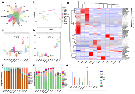 The Venn diagrams reveal that compared with the diet of the N group, the HFD reduced the number of OTUs in the intestinal microbiota and that supplementation with PB and CA reversed this decline (Figure 6A). Consistently with these findings, the supplementation with PB and CA significantly increased the Shannon and Chao1 indexes (Figure 6C,D), indicating an enhancement in the diversity and richness of the microbiota community. Alpha diversity analysis demonstrated that the supplementation with PB and CA may help protect the decrease in microbial richness caused by the HFD. However, no statistically significant differences were observed in the Shannon and Chao1 indexes among these groups. The beta diversity values, calculated by using principal coordinate analysis based on OTU abundance, further indicated that the composition of the intestinal microbiota in the HFD group was completely different from that in the N group. The intestinal microbiota composition in response to the supplementation with PB, CA, and PB + CA was significantly responsive to the HFD (Figure 6B). Although the aggregation of the PC and PB groups at a high dosage was close to that of the M group, a more distinct clustering and a more remarkable change in the gut microbial structure was observed compared with the M group. Notably, the MHB and NHB groups exhibited significant distinct clustering compared with the other groups, indicating that whole-grain highland barley may induce specific changes in the microbial structure. The combination of PB and CA at a low dosage (150 mg/kg b.w.) induced changes in the gut microbial structure close to those in the N group, suggesting that PB + CA may exert effects on the microbial structure similar to those observed in the N group.
