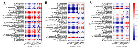Spearman correlation analysis of top 30 genera with hyperlipidemia-related parameters (A) procyanidin B1, (B) coumaric acid, and (C) combination of procyanidin B1 and coumaric acid (* p < 0.05 and ** p < 0.01 denote significance).
