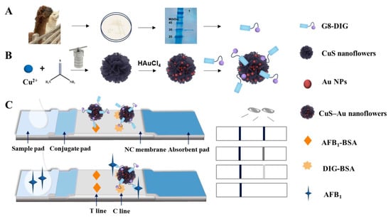 (A) Analysis of the G8-DIG using SDS-PAGE. Lane M, pre-stained protein molecular weight marker; lane 1, protein purified by a nickel column. (B) The synthesis of CuS NFs, CuS NFs-Au, and G8-DIG@CuS NFs-Au probes, and (C) CuS NFs-Au lateral flow immunoassay (LFIA) for AFB1 detection.