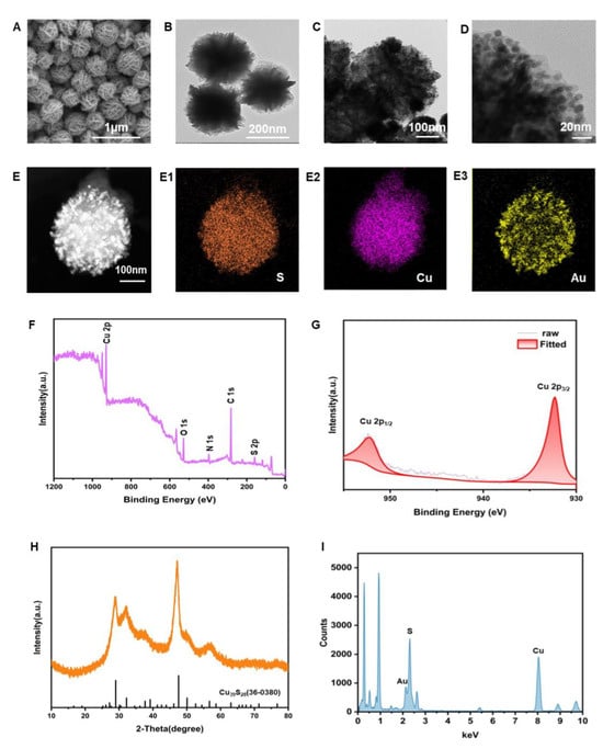 The morphologies of the nanomaterials created using a scanning electron microscope (SEM) and transmission electron microscopy (TEM) characterization are displayed in Figure 2A,B. With an average diameter of 300 nm, the produced nanomaterials had a high degree of homogeneity, resembled flowers, and were reasonably consistent in size. The TEM images in Figure 2C,D demonstrate the successful deposition of Au NPs onto CuS NFs structures. Through high-resolution transmission electron microscopy (HRTEM) (Figure 2D), it can be seen that particles of a size of about 5 nm are grown on the petals of the synthesized, flower-like material. Through element mapping (Figure 2E,E1–E3), it can be seen that Au elements are distributed on the outside of the material, indicating that the particles on the petals are gold nanoparticles. The element composition and elemental valence state of the CuS NFs were characterized using X-ray photoelectron spectroscopy (XPS), as depicted in Figure 2F, confirming the presence of Cu and S. The Cu 2p spectra of the CuS NFs were examined in order to determine their chemical valence state. This revealed two binding energies at 932.39 eV and 952.29 eV, which correspond to Cu 2p3/2 and Cu 2p1/2, respectively (Figure 2G). The X-ray diffraction (XRD) pattern of the CuS NFs exhibited diffraction peaks at 28.86°, 32.13°, 47.08°, 49.74°, and 56.32° corresponding to the hexagonal phase of Cu39S28 (JCPD file No. 36-0380) [31], thus confirming the synthesis of CuS NFs (Figure 2H). The EDS mapping indicated that the synthesized material predominantly consisted of three elements: Cu, S, and Au. This further validated the successful in situ growth of Au nanoparticles on CuS NFs (Figure 2I).