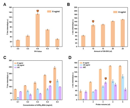 Optimization of CuS NFs-Au LFIA strip. Effects of (A) pH, (B) amount of G8-DIG, (C) AFB1-BSA concentration, and (D) volume of probe. (The heart represents the optimal condition).