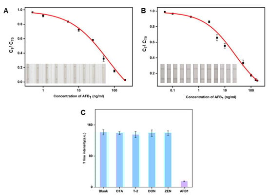 Different concentrations of an AFB1 standard solution were prepared using PBST + 5% PVP K30 sample buffer. The final concentrations of the solution were set at 0.05, 0.1, 0.5, 2.5, 5, 10, 50, 100, 150, 175, and 200 µg/L, and 50 μL of the solution was taken and added to the sample pad. After incubating at 37 °C for 15 min, the T line color intensity (CT) was measured using an immunochromatographic quantitative analysis instrument. The logarithm of the AFB1 concentration was plotted against the CT/CT0 ratio to create a color intensity standard curve, where CT0 is the color intensity of the negative samples. This standard curve served as the basis for calculating the detection limit. All experiments were conducted three times.