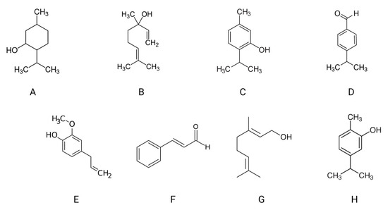 Examples of the main ingredients of essential oils: menthol (A), linalool (B), thymol (C), cuminaldehyde (D), eugenol (E), Cinnamaldehyde (F), myrcene (G), and carvacrol (H) (own elaboration).