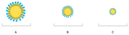 Droplet sizes of macroemulsion: >500 nm (A), microemulsion: <500 nm (B), and nanoemulsion: 10–100 nm (C) (based on [113], own elaboration).