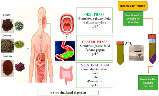 The current study aims to evaluate the in vitro gastrointestinal digestion of Aronia samples using the static method protocol INFOGEST, according to Minekus et al. [31]. The protocol proved effective in simulating the salivary, gastric, and intestinal phases of digestion. The results of this study may provide insights into the digestive properties of Aronia samples and their potential health benefits. Figure 1 shows the flow diagram of the static in vitro model used for black chokeberry fruit, leaves, and pomace digestion and the analysis of individual polyphenols. The salivary phase was simulated by mixing 5 g of sample (fruit, leaves, pomace) with 3.5 mL of simulated salivary fluid (SSF) electrolyte stock solution and mincing the mixture. Subsequently, 0.5 mL of salivary a-amylase solution of 1500 U/mL made up of SSF electrolyte stock solution was added to the mixture, followed by 25 µL of 0.3 M CaCl2 and 975 µL of distilled water. The mixture was then adequately mixed and incubated at 37 °C for 2 min. To simulate the gastric phase, the oral bolus derived from the simulated oral phase was mixed with 7.5 mL of the simulated gastric fluid (SGF). Then, 1.6 mL of a porcine pepsin solution was added to the mixture, resulting in a final concentration of 2000 U/mL. Finally, 5 µL of 0.3 M calcium chloride solution was added. The final volume of the solution was adjusted to 10 mL by adding distilled water after the pH was lowered to 3 with 6 M HCl. The solution was subsequently placed in an incubator at a temperature of 37 °C for 2 h. For the intestinal phase simulation, the gastric chyme was mixed with 11 mL of simulated intestinal fluid (SIF), 5 mL of pancreatin solution (800 U/mL), 2.5 mL of 160 mM bile salts, and 40 µL of 0.3 M CaCl2 and 1 M NaOH to reach pH 7.0. The samples were then incubated at 37 °C for 2 h. After each stage of the in vitro digestion simulation, the samples were subjected to a process of centrifugation. To execute the procedure, we utilized a laboratory-grade refrigerated centrifuge, model 2–16 KL, manufactured by Sigma Laborzentrifugen GmbH in Germany. The samples were spun at a rpm per minute for a duration of 15 min while maintaining a constant temperature of 4 °C. Once the centrifugation was complete, the samples were analyzed using HPLC to identify and quantify the individual polyphenols and to calculate the bioaccessibility index of individual polyphenols.