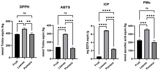 Antioxidant potential of black chokeberry fruits, leaves, and pomace. DPPH—2,2-Diphenyl-1-picrylhydrazyl; ABTS—2,2′-Azinobis-3-Ethylbenzthiazolin-6-Sulfonic Acid; ICP—Iron chelating power; PMo—Phosphomolybdenum method; ns—non significant; ** p < 0.01; *** p < 0.001; **** p < 0.0001.