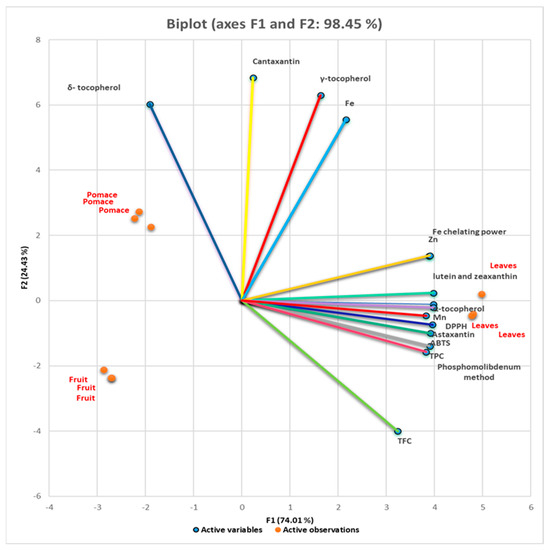 Figure 3 illustrates the biplot correlation of black chokeberry samples. The results showed that 98.45% of the total variation is explained by the first 2 principal components. PC1 covers 74.01% of the variance, and PC2 covers 24.43% of the variance. According to the biplot correlations, the most important variables in PC1 are the polyphenols, antioxidant activity, α-tocopherol, lutein, and zeaxanthin. In PC2, the most important variables are δ- and γ-tocopherol, canthaxanthin, and Fe. The biplot also discriminates the variables among selected samples. The biplot showed that α-tocopherol, TPC, astaxanthin, Mn, antioxidant activity expressed through ABTS, DPPH, and phosphomolybdenum methods were the most definitory variables for leaves and δ-tocopherol for pomace. According to biplot correlation, the analytical results obtained are not directly related to fruit samples.