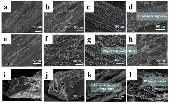 The scanning electronic microscopy (SEM) images of Flammulina velutipes roots (FVR) before and after steam explosion (SE) ((a,e,i): untreated FVR ×200, ×500, ×1000; (b,f,j): steam-exploded FVR at lgR = 2.23 ×200, ×500, ×1000; (c,g,k): steam-exploded FVR at lgR = 3.32 ×200, ×500, ×1000; (d,h,l): steam-exploded FVR at lgR = 3.74 ×200, ×500, ×1000).