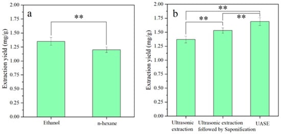 Ergosterol has a dual-molecule structure and is soluble in solvents with some polarity. The effects of two commonly used extraction solvents (ethanol and n-hexane, with ethanol being more polar than n-hexane) on the extraction yields of ergosterol were compared [5,28]. As demonstrated in Figure 4, the yields of ergosterol extracted using ethanol and n-hexane as solvents were determined to be 1.35 ± 0.07 mg/g and 1.20 ± 0.05 mg/g, respectively. The yield of ergosterol using 95% (v/v) ethanol as the extraction solvent was significantly higher than that using n-hexane as an extraction solvent (p < 0.01), and ethanol was easy to recover with less pollution. Meanwhile, n-hexane, as an extraction solvent, had a lower extraction yield for ergosterol but presented relatively fewer impurities in the extracts, owing to its lower polarity. Therefore, 95% (v/v) ethanol was selected as the extraction solvent for ergosterol. Further comparison was performed on the influence of different extraction methods on the extraction yields of ergosterol. The order of the ergosterol yields obtained by different extraction methods was as follows: UASE (1.69 ± 0.07 mg/g) > ultrasound extraction followed by saponification treatment (1.53 ± 0.05 mg/g) > ultrasound extraction (1.37 ± 0.06 mg/g). Clearly, the yield of ergosterol extracted by the UASE method was significantly higher than that for the other two methods (p < 0.01). Saponification is a hydrolysis reaction whereby the hydroxide can break the ester bonds between fatty acids and glycerol in triglycerides, converting conjugated ergosterol into free ergosterol. This promoted the rapid dissolution and dispersion of ergosterol from the mycelium cells into the solvent, thereby increasing the extraction yield of ergosterol. The high yield of ergosterol obtained by the UASE method may have been due to the cavitation effect generated by the ultrasound waves, which accelerated the breakdown of the fungal cell wall and promoted the saponification reaction [5]. Therefore, through process optimization, the 95% ethanol solution was chosen as the extraction solvent, and the UASE method was used to prepare ergosterol.