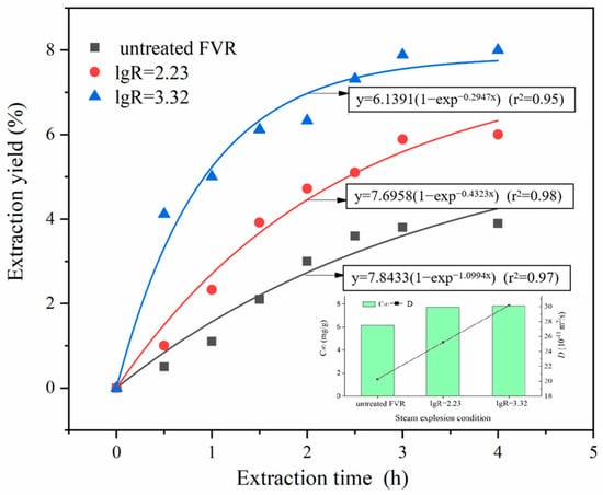 Figure 6 presents the extraction kinetic curves and parameters of the polysaccharides from FVR before and after SE treatment. As depicted, the extraction yield of polysaccharides from untreated FVR gradually increased with the prolonged extraction time, eventually reaching a maximum value of 3.90% after 4 h of extraction. The extraction yield of polysaccharides from the steam-exploded FVR exceeded the final polysaccharide yield of the untreated FVR samples after only 0.5 h of extraction. Under the SE conditions of an explosion pressure of 1.1 MPa and retention time of 7 min, the C∞ of polysaccharides was calculated to be 78.40 mg/g, which was an increase of 27.69% compared to that of the raw materials; the mass transfer coefficient (D) was 30.150·10−11 m2/s, which was 0.49 times higher than that of the raw materials. These findings indicate that SE can significantly promote the dissolution and release of polysaccharides from FVR. One reason for this is that the physical explosion effect produced during the instantaneous decompression stage can destroy the dense lamellar structure inside the mycelia, thus exposing the internal structure and increasing the porosity and specific surface area [29]. The destruction effects of SE on the mycelia’s multi-scale structure may enhance the accessible surface area for the solvent to establish contact with the solute and open up the channels for the release of the solute, leading to a reduction in the mass transfer resistance and an increment in the mass transfer coefficient, finally promoting the dissolution of the polysaccharides. The other reason is that the hydrothermal reactions that occur during the SE process may induce the thermal degradation of the structural macromolecules within FVR. Certain components, such as chitin and glucan, that constitute the cell walls are prone to melting and hydrolyzing under thermal and acidic conditions. The hydrogen bonds and glycosidic bonds within these molecules are easily broken at high temperatures, thereby transforming structural polymers into water-soluble substances [13]. This may cause a some insoluble dietary fiber to be converted into soluble dietary fiber, which significantly increased the theoretical maximum extraction concentration (C∞) of the polysaccharides in the steam-exploded FVR [17]. Therefore, the increment in the polysaccharide content after SE treatment can be attributed to the improved dissolution of the polysaccharides, induced by structural changes and the partial transformation of insoluble dietary fiber.