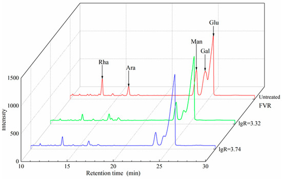 The gas chromatography profiles and monosaccharide compositions of the polysaccharides prepared from FVR before and after SE are shown in Figure 7 and Figure S2 and Table 4. The polysaccharides of all FVR samples mainly consisted of five monosaccharides, glucose, galactose, mannose, rhamnose and arabinose, which was in accordance with other work [4]. The monosaccharide composition of the polysaccharides changed significantly after SE treatment. The highest molar ratio of glucose in the polysaccharides from steam-exploded FVR reached 43.85 mol%, with an increase of 64.06% compared to the polysaccharides from untreated FVR. This is primarily because the SE process can cause the thermal degradation of the cell wall components, such as chitin and glucan, resulting in more soluble components that can be easily extracted into polysaccharides, thereby increasing the polysaccharide content and the proportion of these saccharides within the polysaccharides. Compared to the polysaccharides from untreated samples, the molar ratios of rhamnose, arabinose, mannose and galactose in the polysaccharides from the steam-exploded FVR were decreased by a maximum of 55.05%, 40.17%, 53.05% and 71.33%, respectively. This could have been due to the fact that the higher proportion of glucose in the polysaccharides led to relatively lower molar ratios of other saccharides. Moreover, SE may cause the decomposition of polysaccharides containing these monosaccharides, which makes them difficult to precipitate with ethanol, also contributing to the lowered molar ratios of galactose, mannose, rhamnose and arabinose.