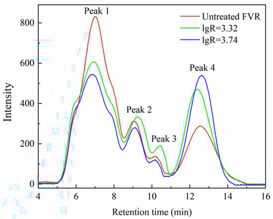 The molecular weight distribution of the polysaccharides from FVR before and after SE is depicted in Figure 8 and Figure S3 and Table 5. The polysaccharides mainly contain four different molecular weight fractions. This indicates that the prepared polysaccharides should be composed of highly dispersed, heterogeneous polysaccharide fractions. For the polysaccharides from untreated FVR, peak 1, with a number-average molecular weight (Mn) of 2.12 × 106 Da, accounts for the largest peak area percentage (66.40%). Under the severest SE conditions (explosion pressure 1.5 MPa and retention time 7 min), the Mn corresponding to peak 1 in polysaccharides is decreased to 1.54 × 106 Da, where the weight-average molecular weight (Mw) reduced to 2.04 × 106 Da and the relative peak area percentage decreased to 52.15%. The peak area percentages of other lower-molecular-weight fractions (peaks 2, 3, and 4) increased, especially peak 4, which rose from 17.87% to 34.04%. These results suggest that SE can cause the transformation of high-molecular-weight polysaccharides to low-molecular-weight polysaccharides, resulting in a reduction in the overall molecular weight distribution [15]. This may be due to two reasons: firstly, the thermal degradation or acid-like decomposition of polysaccharides in the intrinsic polysaccharides, such as gums, occurs during the SE process of FVR roots, resulting in a reduction in their molecular weights; secondly, SE could destroy the structural polysaccharides in the cell walls of FVR by weakening the glycosidic bonds and hydrogen bonds within and between the polysaccharide chains, causing the destruction of their spatial structure and the cleavage of the molecular chains [17]. Both of these contributed to the reduced degree of polymerization and the lowered molecular weight of the polysaccharides. The changes in the molecular weight distribution of polysaccharides would help to improve their extraction performance and physiological function.