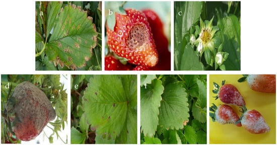 Images of the seven diseases in strawberries and their leaves: (a) angular leaf spot; (b) anthracnose fruit rot; (c) blossom blight; (d) gray mold; (e) leaf spot; (f) powdery mildew leaf; (g) powdery mildew fruit.