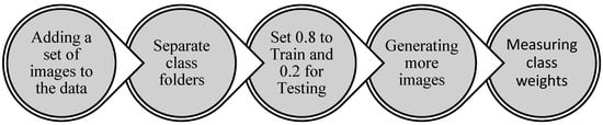 An imbalance in class distribution was initially observed in the dataset, as illustrated in Table 1. The first approach undertaken to address this issue involved generating additional images for classes with the fewest number of images, namely anthracnose and powdery mildew fruit. Sets of new images were generated through background removal, flipping, and blurring of the existing images. Due to the limited number of images, approximately 70, achieving a balanced dataset through image generation, however, was not feasible. The other attempt to address this challenge was to adopt a technique involving a weighted sampling function, where a higher representation will have a smaller weight []. This approach assigns higher weights to the minority class samples and lower weights to the majority class samples during the model training process, amplifying the impact of the minority classes on prediction []. First, the dataset was split into 0.8 and 0.2 for training and testing, respectively. Addressing the initial dataset’s imbalance issue, weights were calculated and assigned to each class via the ‘WeightedRandomSampler’ in PyTorch [,]. Table 2 shows the calculated weights for each class and the details of the augmentation step. Figure 3 schematically shows the preprocessing steps in this study. The details of the augmentation are depicted in Table 2.