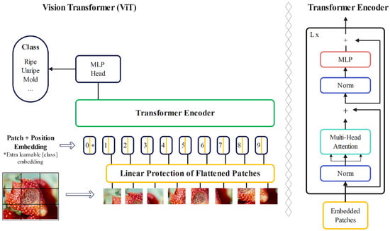 A standard transformer architecture was used to process both token embeddings and 2D image data. Images were converted into sequences of flattened patches, which were then mapped to a fixed-size vector. Positional information was maintained using standard 1D position embeddings. The transformer encoder consists of alternating layers of self-attention and multi-layer perceptron (MLP) blocks, with layer normalization and residual connections. This setup allows the model to effectively represent and process both textual and image data []. ViT differs from CNNs in its inductive bias, utilizing the two-dimensional neighborhood structure sparingly, primarily by dividing the image into patches. Adjustments to position embeddings were made during fine-tuning for images of different resolutions. Unlike CNNs, ViT’s position embeddings contain no initial information about patch positions, requiring the model to learn spatial relationships between patches from scratch []. Instead of raw image patches, the input sequence can be made from feature maps of a CNN. In this hybrid model, patches from the CNN feature map underwent patch embedding projection. Patches with a spatial size of 1 × 1 flattened the feature map’s spatial dimensions, projecting it to the transformer dimension. Classification input and position embeddings were added as described []. The encoder part of the original transformer architecture was employed by the ViT, and the decoder was not utilized. A sequence of embedded image patches, with a learnable class embedding prepended to the sequence, was taken as input to the encoder, which was augmented with positional information. The self-attention mechanism, a key component of the transformer architecture, was employed. Importance scores were assigned to patches by the model, allowing it to understand the relationship between different parts of an image and focus on the most relevant information. This aids in better comprehension of the image and enables the model to perform various computer vision tasks. Following this, a classification head attached to the output of the encoder received the value of the learnable class embedding to output a classification label. Figure 4 illustrates all of these processes.