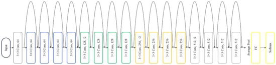 ResNet18’s key feature is its depth with many layers, which helps to extract distinctive features in complex image classification tasks []. It deals with a common problem called “vanishing gradient”, which can make training difficult. To address this, “residual connections” allow the network to skip certain layers during training, making it easier to train deep models []. This approach demonstrated that deeper networks achieved improved optimization and accuracy []. Traditional deep networks face difficulties in training, however, and increasing the number of layers does not guarantee better learning outcomes. As deeper networks converge, accuracy plateaus and then rapidly declines. Residual learning tackles this issue by learning residual mappings rather than direct mappings. The original ResNet-18 architecture comprised eighteen layers, known as residual including convolutional layers with 3 × 3 filters and downsampling layers with a stride of 2. Figure 6 illustrates the architecture of the original Resnet18. These blocks played a crucial role in improving how the network learns intricate features from input data. Throughout the network, residual shortcut connections were inserted between layers, either maintaining the same dimensions or adjusting for dimensionality changes. Residual block operation can be expressed as follows: