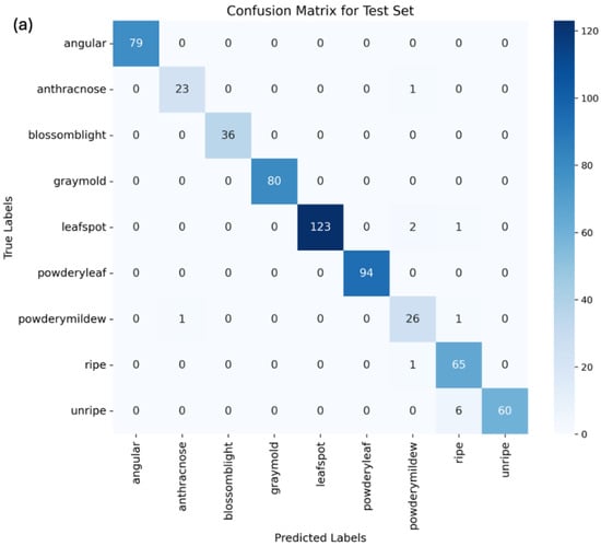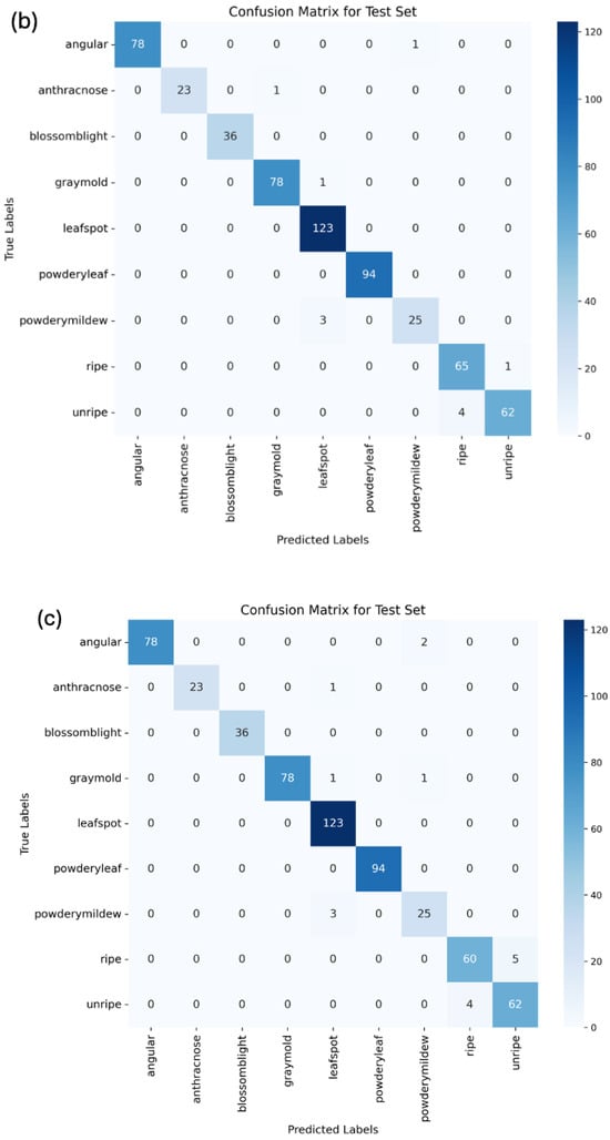 The confusion matrices for the vision transformer, MobileNetV2, and ResNet18 models highlight instances of misclassification, which requires more discussion. In the vision transformer model, anthracnose was once misclassified as blossom blight. Additionally, powdery mildew was once confused with gray mold, both presenting mold-like symptoms, which may make them difficult to distinguish, especially in the early stages. Unripe strawberries were misclassified as ripe strawberries six times, due to variability in color through their growth.