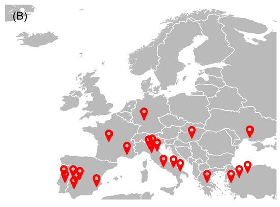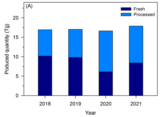 (A) Quantity of tomato produced to be consumed fresh and after processing in the EU (based on [17]); (B) main tomato processing industries in Europe within the top 50 companies in the sector worldwide (based on [20]).