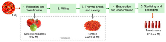 The industrial process for tomato transformation into sauce or paste comprises multiple unit processes, as depicted in Figure 2. Globally, the tomatoes are first evaluated and selected, rejecting the defective tomatoes. Those that meet the quality requirements are driven with water through the production lines facilitating transport and the washing step. Then, the tomatoes are milled and subjected to a thermal shock to secure enzymatic inactivity, preventing product degradation. The peels and seeds are separated from the pulp through sieving with rotating blades. The pulp is then dehydrated using vacuum and temperature to obtain a concentrated product. In the final step, the products are subjected to high temperatures and quickly cooled for sterilization before being bottled [21]. Overall, these industries produce large amounts of residues in the sieving step, which is commonly named tomato pomace and is composed of peels, seeds, and some pulp. According to the literature, about 2–5% of the raw material weight corresponds to tomato pomace [22]. Thus, around 332 Gg of tomato pomace were generated by industries in the EU in 2021. During the selection and washing step, the immature, defective, or damaged tomatoes are also discarded, and the amount of rejection typically corresponds to 2% of the raw material weight [23].