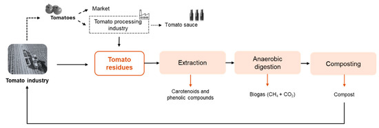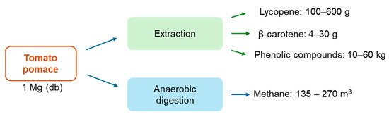 - Allison, B.J.; Simmons, C.W. Valorization of tomato pomace by sequential lycopene extraction and anaerobic digestion. Biomass Bioenergy 2017, 105, 331–341. [Google Scholar] [CrossRef]