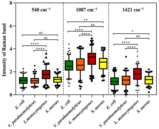Raman intensity of four foodborne pathogens at peaks 540 cm−1, 1087 cm−1 and 1421 cm−1. Box plots represent the median and first and third quartiles, with the whiskers representing the minimum and maximum values within 1.5 interquartile ranges from the first and third quartiles. Black dots with different shapes indicate outliers. Two-tailed t-tests were used to compare the statistical significances. ns p > 0.05, * p ≤ 0.05, ** p ≤ 0.01, **** p ≤ 0.0001.