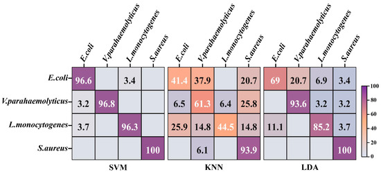 The confusion matrix of four foodborne pathogens based on machine learning models. SVM: support vector machine; KNN: K nearest neighbor; LDA: linear discriminant analysis.