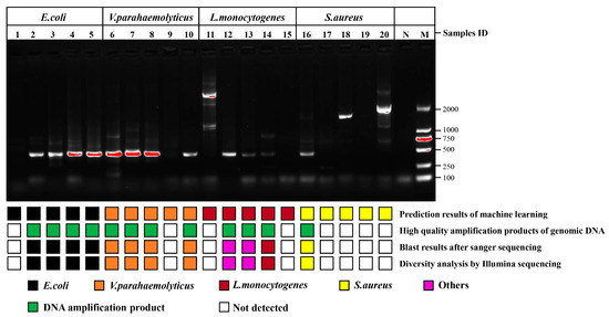 Comparison of upstream predicted phenotypes based on classification model and downstream genotypes based on genome sequencing. High-quality amplification products of genomic DNA represent the specific bright bands in the gel electrophoresis images of 16S rRNA PCR products from post-RACE cells using primers pair 341F and 806R. Lanes 1 to 5 were E. coli, lanes 6 to 10 were V. parahaemolyticus, lanes 11 to 15 were L. monocytogenes, lanes 16 to 20 were S. aureus, lane N and lane M were negative control and marker, respectively.