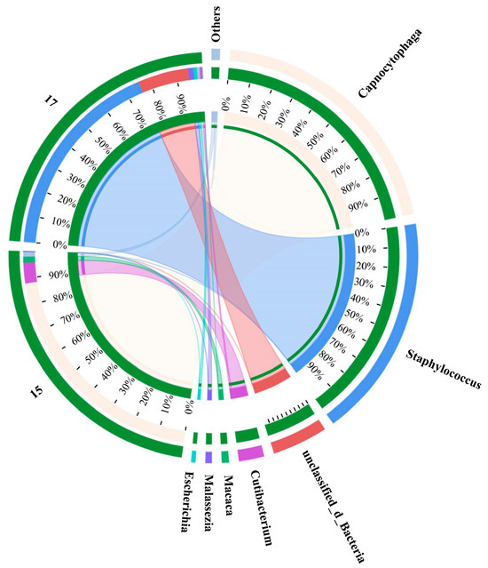 Distribution analysis of species in samples 15 and 17. Sample 15 was L. monocytogenes and sample 17 was S. aureus. The right side of the circle represents the main dominant species contained in each sample, and the abundance distribution of different species in the sample is shown by the connection of the inner ribbon.