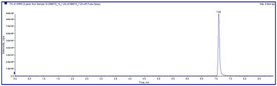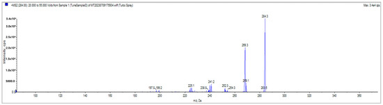 The mass spectrometer utilized electrospray ionization (ESI) in the positive ion mode with a spray voltage of −5500 V and a vaporizer temperature of 450 °C. Under these conditions, no sample contamination or sample overlapping was observed. The instrument was operated in multiple reaction monitoring (MRM) mode. The collision energies were optimized for individual analytes. The “compound-dependent” parameters—declustering potential (DP), entrance potential (EP), collision energy (CE), collision cell entrance potential (CEP), and collision cell exit potential (CXP)—for the API 3200 MS/MS system are presented in Table 2 for methylene blue. Declustering potential (DP) refers to the voltage applied to break up clusters of ions, entrance potential (EP) is the voltage that helps ions enter the mass spectrometer, collision energy (CE) is the energy used to fragment the ions, and collision cell entrance potential (CEP) and collision cell exit potential (CXP) are voltages applied to control the movement of ions into and out of the collision cell, respectively. The retention time for methylene blue was 7.02 min, as shown in Figure 2 and Table 2. The mass spectrum of methylene blue is shown in Figure 3.