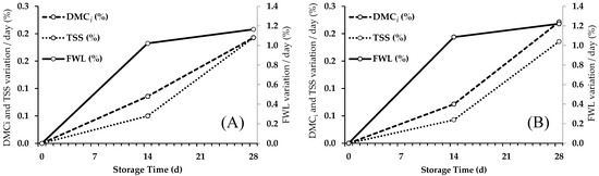 A similar behavior in the average daily variation was observed in both mini-conical (Figure 1A) and conical (Figure 1B) peppers concerning the percentage of FWL, DMCi, and TSS measured at 0, 14, and 28 d. A gradual daily weight loss was observed along with daily increases in dry matter and soluble solid content over time. The magnitude and rate of change were similar in dry matter and soluble solids. In contrast, although the pepper’s weight loss, dry matter, and TSS content all increased over time, the magnitude and rate of change were different in these variables. The daily weight loss had a more pronounced rate of change initially, which subsequently decreased from day 14 onwards. Conversely, the DMCi and TSS content exhibited a more constant increase over the storage period.