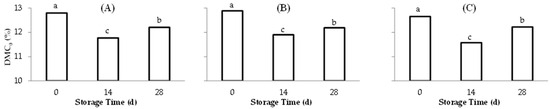 In general, DMCi and TSS measured at 0, 14, and 28 d tended to increase with storage time in both pepper types and a significant positive linear effect was observed using orthogonal contrast analysis. This phenomenon reflects an increasing trend of total solids and soluble solids in relation to the total fruit content at the time of measurement.