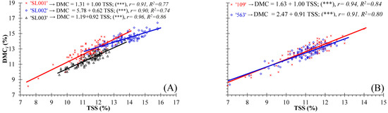 Models representing the relationships between the fruit’s dry matter content (DMCi, %) and total soluble solids content (TSS, %) at harvest time for fruit from: (A) cultivars ‘SL001’, ‘SL002’, and ‘SL003’; (B) cultivars ‘109’ and ‘563’. R2, is the coefficient of determination; r, the correlation coefficient; significant for *** p ≤ 0.001.