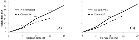Evolution of fruit weight loss (%) for the commercially and non-commercially viable fruit as a function of storage time. The results correspond to the average for the (A) mini-conical cultivars; (B) conical cultivars, based on the analysis of variance, according to the model Yij = µ + αi + εij performed at 7, 14, and 21 storage days. n.s., not significant; significant for *** p ≤ 0.001.