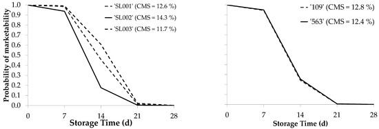 Figure 5 shows the average marketability probability models for each pepper cultivar type shown in Table 3. Additionally, it indicates the average dry matter content associated with each cultivar at harvest time (day 0) used to determine its relationship with the shelf-life. In conical cultivars, the marketability probabilities and dry matter content were similar (12.8 and 12.4% for ‘109’ and ‘563’, respectively). In ‘mini-conical’ cultivars, ‘SL002’ had the lowest marketability probability and the highest dry matter content (14.3%), whereas ‘SL003’ had the highest marketability probability and the lowest dry matter content (11.7%), and the ‘SL001’ cultivar had an intermediate marketability probability and dry matter content (Table 3 and Figure 5).