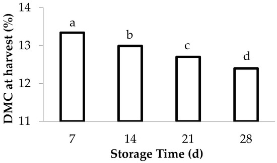 The results shown in Table 3 and Figure 5 suggest that cultivars with lower dry matter content have a higher marketability probability, and vice versa. Consequently, the effect of dry matter content on shelf-life was studied by jointly analyzing fruit from all cultivars (conical and mini-conical). Figure 6 indicates that peppers with a higher dry matter content at the time of harvest become unmarketable sooner than fruit with lower dry matter content. Specifically, fruit that were no longer marketable after 7 days of storage had an average dry matter content of 13.3% at the time of harvest. Fruits that were unmarketable after 14 days of storage had an average dry matter content of 13.0% at harvest, and those that ceased to be marketable after 21 days of storage had an average dry matter content of 12.7% at harvest. Finally, fruit that lost their commercial viability after 28 days of storage had an average dry matter content of 12.4% at harvest (Figure 6). Thus, a lower percentage of dry matter at harvest time may extend the marketability period of fruit during storage.