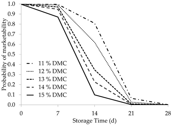 Marketability probability during storage based on the dry matter content (DMCi, %) of the fruit at harvest. The average results of all the cultivars (‘SL001’, ‘SL002’, ‘SL003’, ‘109’, and ‘563’) were included.