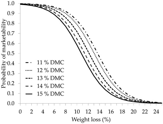Additionally, the results showed that fruit with a higher dry matter content at harvest were more susceptible to deterioration when they experienced weight loss during storage than fruit with lower dry matter content at harvest. According to the data presented in Figure 8, if some fruit with a dry matter content of 11% loses 10% of its weight during storage, its marketability probability decreases by 83%. Contrastingly, if the initial dry matter content is 15%, the marketability probability decreases further, dropping to 59%.